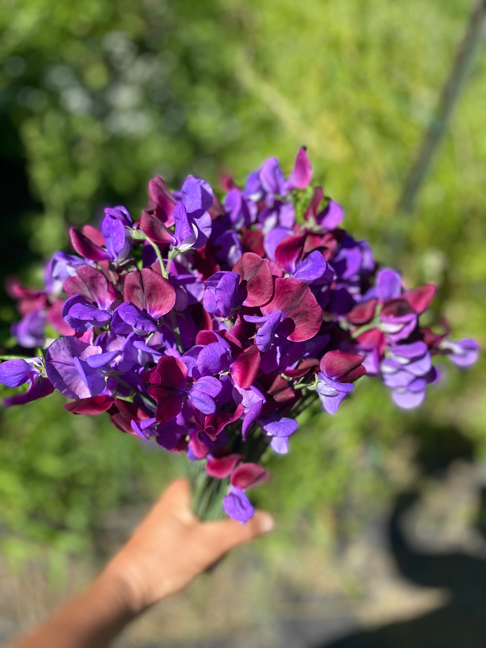 Heirloom variety, the maroon and violet bicolored flowers will melt your heart. Especially strong scent and heat tolerant this is a must grow! Long stems are great for bunching. Gets 5” tall and needs trellising.