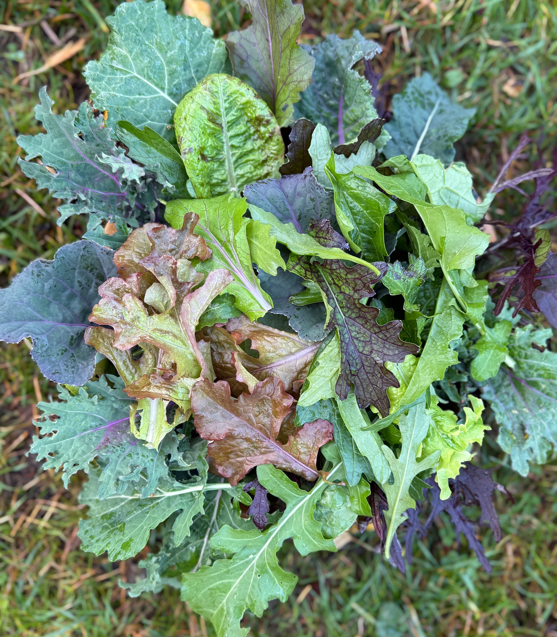 This is my own personal favorite mix of greens to harvest and eat fresh any time of year. I like to chop sturdy greens into smaller bites and mix them in with the more delicate lettuces; add some colorful mustards and a light dressing and mwhaaa!