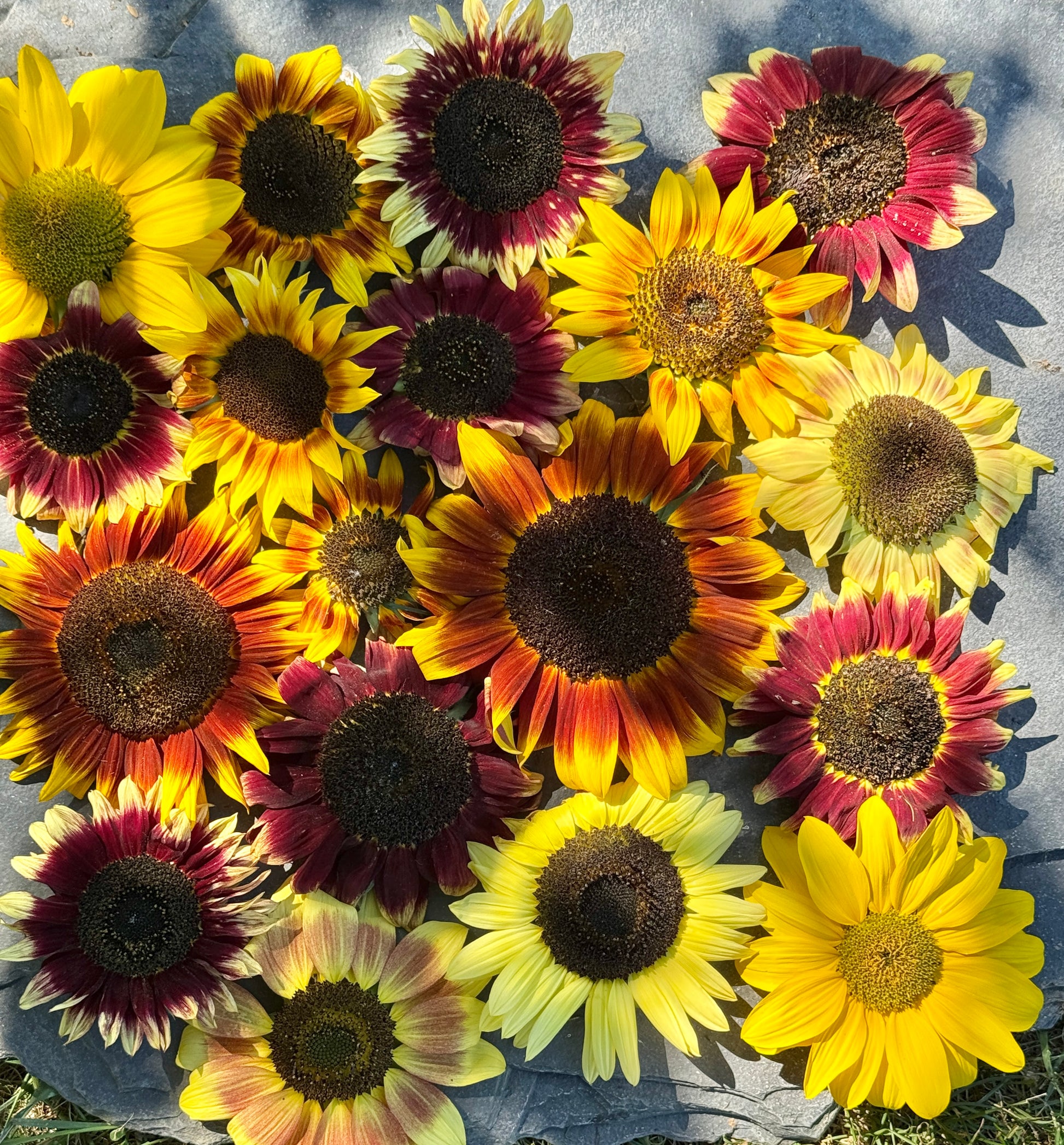 Beautiful multi-colored branching Sunflowers with vibrant yellow, dark brown and red Autumnal colors. This variety is shorter and more compact than others, growing to 4 feet tall. Many stems and blooms per plant, these are a delight in the garden. Leave the seed heads for the bird and watch the acrobatic moves of your neighborhood chickadees and finches munching the seeds.